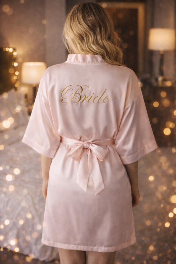 Bata satinada color rosa suave, ideal para la previa del gran día. Diseño liso al frente y bordado “Bride” en la espalda en tono dorado, que aporta un detalle elegante y especial. Incluye lazo para ajustar en la cintura. Perfecta para sesiones de fotos, preparación de la novia y momentos únicos antes del “sí”.