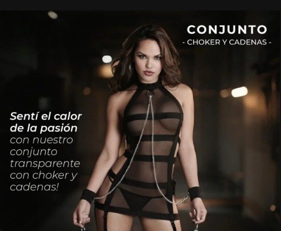 Un diseño cargado de actitud y erotismo, ideal para quienes disfrutan jugar con el poder de la seducción. Este conjunto incluye un vestido de red con tiras estratégicas, choker con argolla, cadenas desmontables y muñequeras a juego.