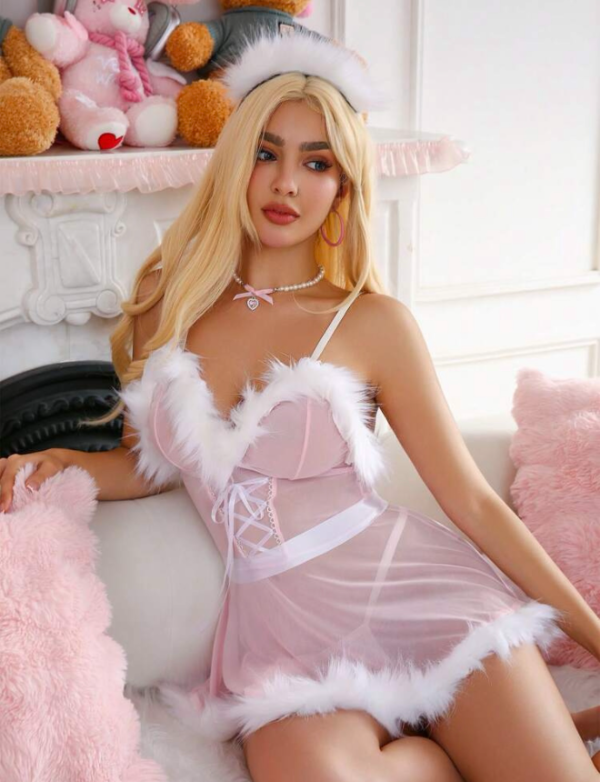 Transformá tus momentos más dulces con este encantador set compuesto por un mini vestido de tul rosa con bordes de peluche blanco, un lazo de cinta satinado para ajustar la cintura, una tanga a juego y una vincha con orejitas peluditas.