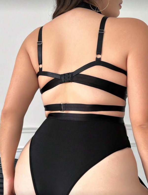 Incluye corpiño estructurado con tiras ajustables, panty alta de lycra, ligas con sujeción doble y un choker con aplique metálico.