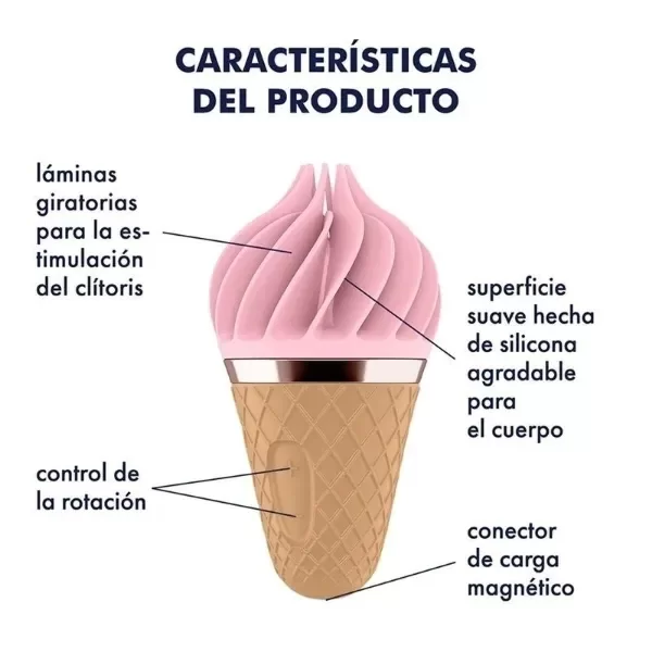 El Satisfyer Sweet Treat es probablemente el más dulce de todos los vibradores para clítoris, ya que la bola de helado sobre el discreto croissant lo tiene todo: Con sus láminas giratorias, tu clítoris llegará a unos orgasmos súper dulces nunca antes imaginados. La silicona, deliciosamente suave y agradable a la piel, envuelve la perla de placer y cuida de tu bienestar sexual con una gran devoción, sin importar dónde estés. El seductor cono se adapta cómodamente a la mano, de modo que puedes controlar fácilmente los 10 emocionantes niveles de vibración, que constan de 4 ritmos de rotación y 3 velocidades de derecha e izquierda cada uno, a través de los botones +/-.