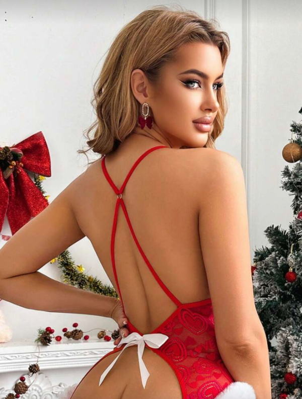 Body navideño rojo de encaje con detalles en peluche blanco que despiertan todas las miradas. Su diseño cavado estiliza la figura y el escote profundo con pompones aporta un toque juguetón e irresistible. Espalda descubierta con tiras finas ajustables para un calce sensual y cómodo.