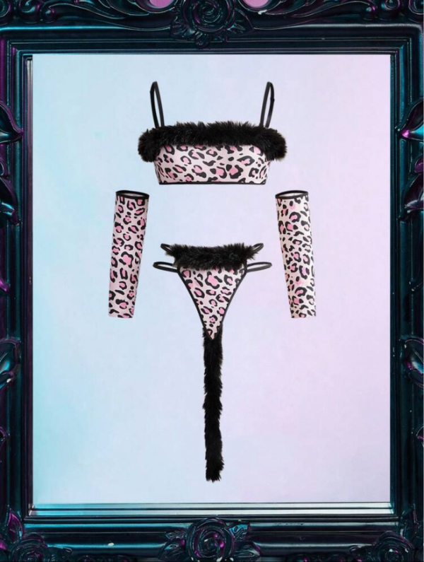 Conjunto de fantasía felina en estampa animal print rosa con detalles de pelo sintético negro.