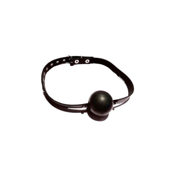 Mordaza de cuero ajustable, con pelota chica de goma. Material de excelente calidad.