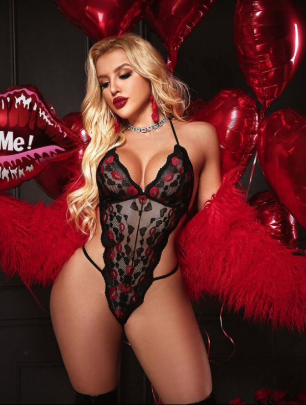 Body de tul transparente con bordado de labios rojos y detalles en encaje negro que enmarcan la silueta de forma impactante.