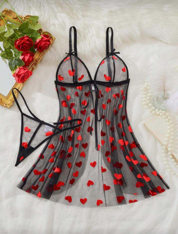 Está compuesto por un baby doll de tul negro transparente, decorado con bordado de corazones rojos aterciopelados, tiras finas ajustables y un delicado lazo frontal que realza el escote.