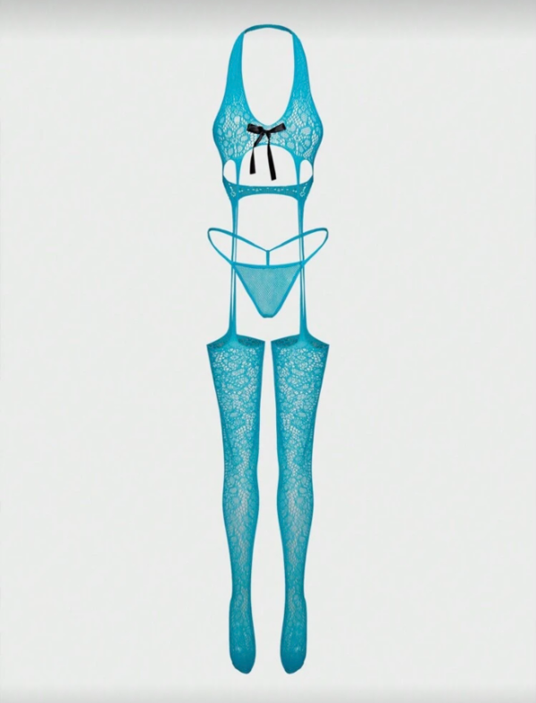 Conjunto erótico de una sola pieza con encaje floral, tiras finas y medias incorporadas. Se adapta al cuerpo resaltando curvas y generando un efecto visual impactante. Una prenda pensada para destacar desde el primer vistazo.
