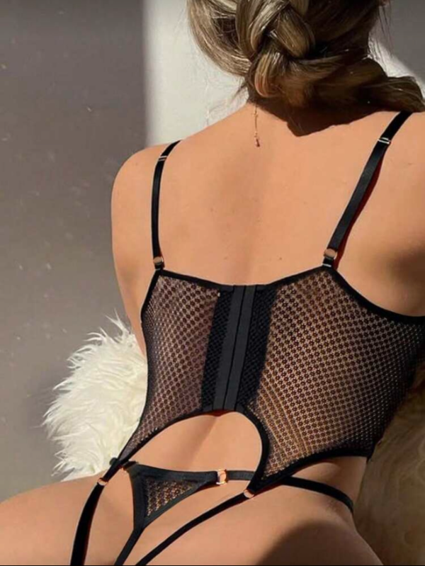 Body confeccionado en red fina y elástica en color negro, diseñado para resaltar la silueta con un equilibrio perfecto entre sensualidad y sofisticación.