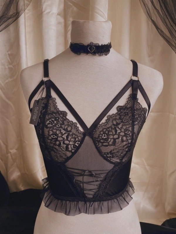 Corpiño confeccionado con microtul, puntilla, elasticos, voladitos, espalda regulable y detalle de acordonado con cinta de raso al frente.