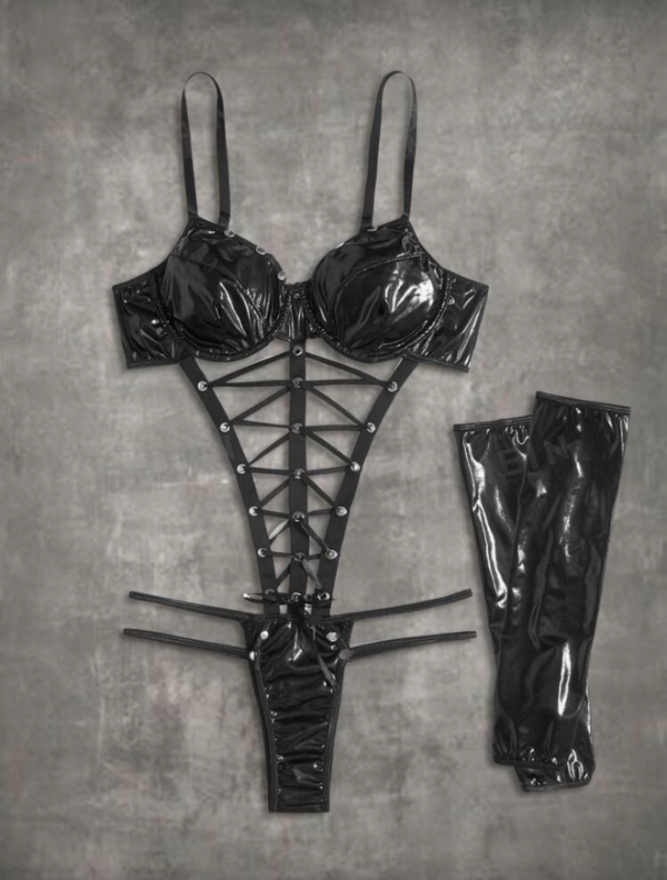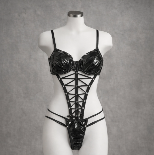Inspirado en la estética fetish, este set combina vinilo brillante con tiras cruzadas y detalles metálicos que aportan personalidad y actitud.