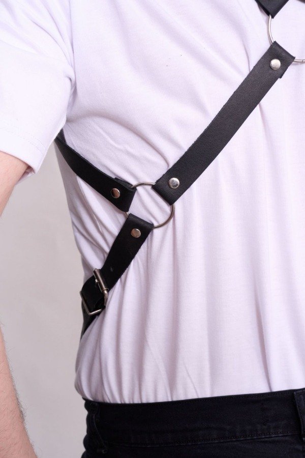 Arnés masculino de ecocuero negro con diseño en X en la espalda y correas ajustables laterales. Su estructura estiliza el torso y aporta una estética fuerte, segura y provocadora. Ideal para sumar actitud, juego y presencia, incluso combinado con ropa para un look urbano con impronta fetish.