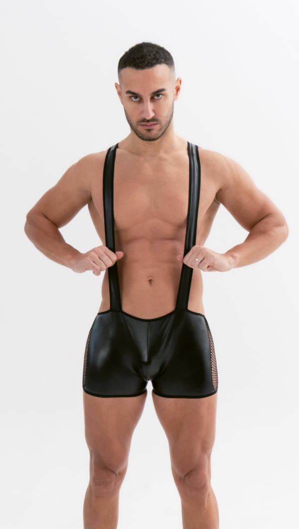 Atrevete a llevar el podercon este mono estilo arnés de efecto cuero que eleva la sensualidad al máximo. Con tirantes que moldean el torso y detalles en red en los laterales, esta pieza está diseñada para quienes disfrutan destacar y dominar la escena. La parte trasera con argolla metálica aporta un toque fetichista irresistible.