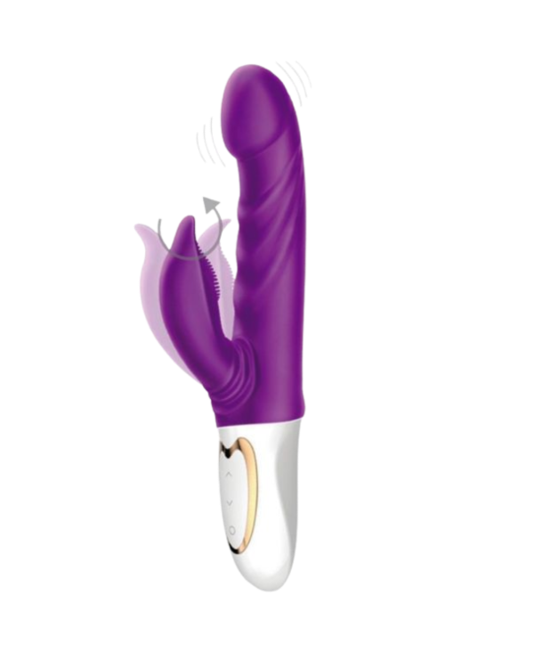 Este vibrador recargable de doble estimulación con su extremo curvo, te llevará a otro universo con su hermoso diseño e intensidad. Su estimulador Clitorial texturado con forma de conejo y su balanceo de izquierda a derecha hará que puedas llegar a una gran excitación. Su vaginal curvo hará que puedas disfrutar del apoyo perfecto en Punto G. Totalmente silencioso y discreto.