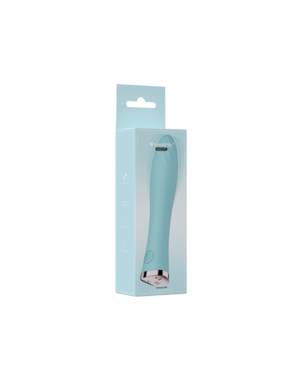 Descubrí una experiencia de estimulación cómoda, suave y práctica con este vibrador Passion Play de diseño elegante en color verde agua. Su formato ergonómico y tamaño real de 15 cm aprox. lo vuelven ideal para un manejo sencillo y placentero.